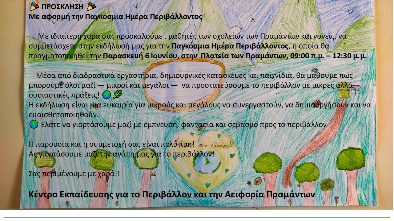 Με αφορμή την Παγκόσμια Ημέρα Περιβάλλοντος, το Κέντρο Εκπαίδευσης για το Περιβάλλον και την Αειφορία Πραμάντων διοργάνωσε μια ξεχωριστή εκδήλωση την Παρασκευή 6 Ιουνίου 2025, στην  Πλατεία των Πραμάντων, 09:00 π.μ. – 12:30 μ.μ.  με στόχο την ενημέρωση, την ευαισθητοποίηση και την ενεργή συμμετοχή της σχολικής και τοπικής κοινότητας στην προστασία του περιβάλλοντος.
